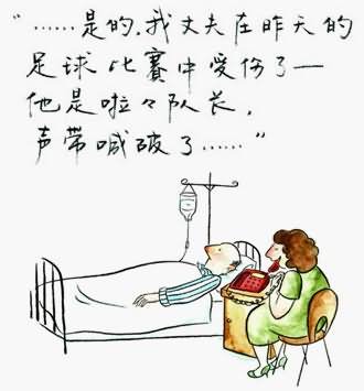 “……是的,我丈夫在昨天的足球比赛中伤了—他是啦啦队长声带喊破了……”