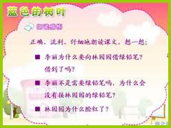 读了课题,大家是不是觉得很奇怪,树叶为什么会是蓝颜色的呢?学习完课文后你们就会明白了!