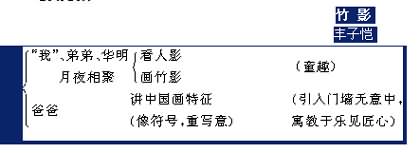 教师点拨、归结主要情节:“我”和弟弟、华明日夜相聚、探讨弟弟提出的问题、依照竹影描竹、爸爸讲中国画的艺术特征。