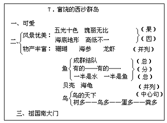 (二)课文的七个自然段,是分几个方面介绍西沙群岛的?(学生结合板书回答。)