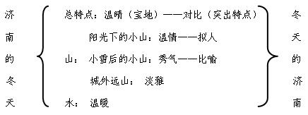 全文思路清晰,安排有序。先总提济南冬天“温晴”的特点,再从济南的山、水两方面写出济南冬天的这一特点,最后以一句简明有力而耐人寻味的话结束全文。寓情于景,情景交融是本文写作的一个特点。优美的意境中,表达出作者赞美的真情。