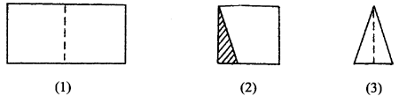 (这一折纸活动要充分让每个学生进行尝试,可讨论,可商量。教师要舍得花时间让学生发表意见,讲解方法,说明道理,并要注意多给学生激励和帮助,鼓励学生在实践活动中标新立异。通常,把正方形对折的四种方法学生都能想到,对过正方形中心任意折一条折痕就能把正方形分成形状和大小都相同的两部分的方法学生不易想到,教师讲了方法以后有部分学生恐怕也想不通,教师应用下面的方法进行启发,进行验证:让学生观察前四种分法的折痕,说出它们有什么共同的地方?这个四条折痕的交点其位置非常特殊,如图5(1),我们可以大胆猜想:过这个交点另折一条折痕,也能把正方形分成形状和大小都相等的两部分吗?试一试,如图5(2),然后把正方形沿这折痕剪开,把两部分比较,完全相同,如图5(3),从而得出有无数种办法把这个正方形分成形状和大小都相同的两部分。这一方法的得到也是十分有趣的。说明正方形具有很多性质,有待我们去研究。)