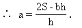 小结:对于梯形面积公式的变形,要求每一个同学都应该很熟练.不仅会用S、b、h表示a,还要会用S、a、h表示b及用S、a、b表示h.请同学们自己进行梯形公式变形的练习.