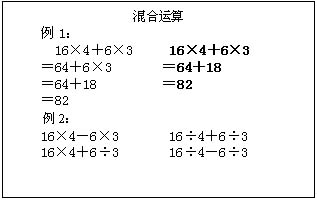 总结:通过比较,我们知道,求两个乘积的和(或差),求两个商的和(或差)以及一积一商的和(或差)的混合式题,都要先算出积,或商,两个乘法可以同时脱式,两个除法也可以同时脱式,一乘一除。