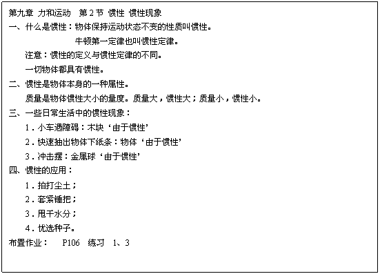 下面再看两个例子:(放投影片:1.直尺击打棋子;2.汽车紧急刹车。) 同学们再想一下:为什么行驶中的汽车突然遇到意外的情况,刹车后,不能马上停下来,还要继续向前运动一段距离才能停下来?(学生回答) [然后全体学生看书](p105倒数第1段) 所以我们在上学或放学回家的路上一定要遵守交通法规,注意交通安全。 惯性既有有害的一面,也有有利的一面,最后我们通过几个例子,了解一下惯性的应用。 四、惯性的应用: 1.拍打衣服上的尘土; 2.套紧松动了的锤把; 3.甩干洗手后水份; 4.用扬场机优选种子。 展标(小结):(放投影片) 1.知道什么是惯性。 2.要注意惯性定义与惯性定律(牛顿第一定律)的区别。 3.会用惯性的知识解释简单的现象。 布置作业:p106练习1、3 | |||||||