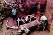 | 侏罗纪中期世界性的陆相地层和陆生脊椎动物化石贫乏的情况并没有太大的改观,但是在我国四川省自贡地区,大自然却留下了一块埋藏着丰富历史遗物的风水宝地,这个地方叫做大山铺。 大山铺的岩层中埋藏有许多具完整的素食恐龙化石骨架,也同时埋藏了许多巨大的针叶树的树干化石。这些恐龙化石告诉了我们许多过去不知道的大型恐龙(尤其是四足行走的素食恐龙)的种群状况。这些恐龙生活在水源充足的低地森林里,充足的食物和适宜的环境使它们的身体长到了非常巨大的地步。尤其是那些长脖子的蜥脚类恐龙,可以伸长脖子取食到其它的动物都够不着的高高的树顶上的叶子。 | ![]() |